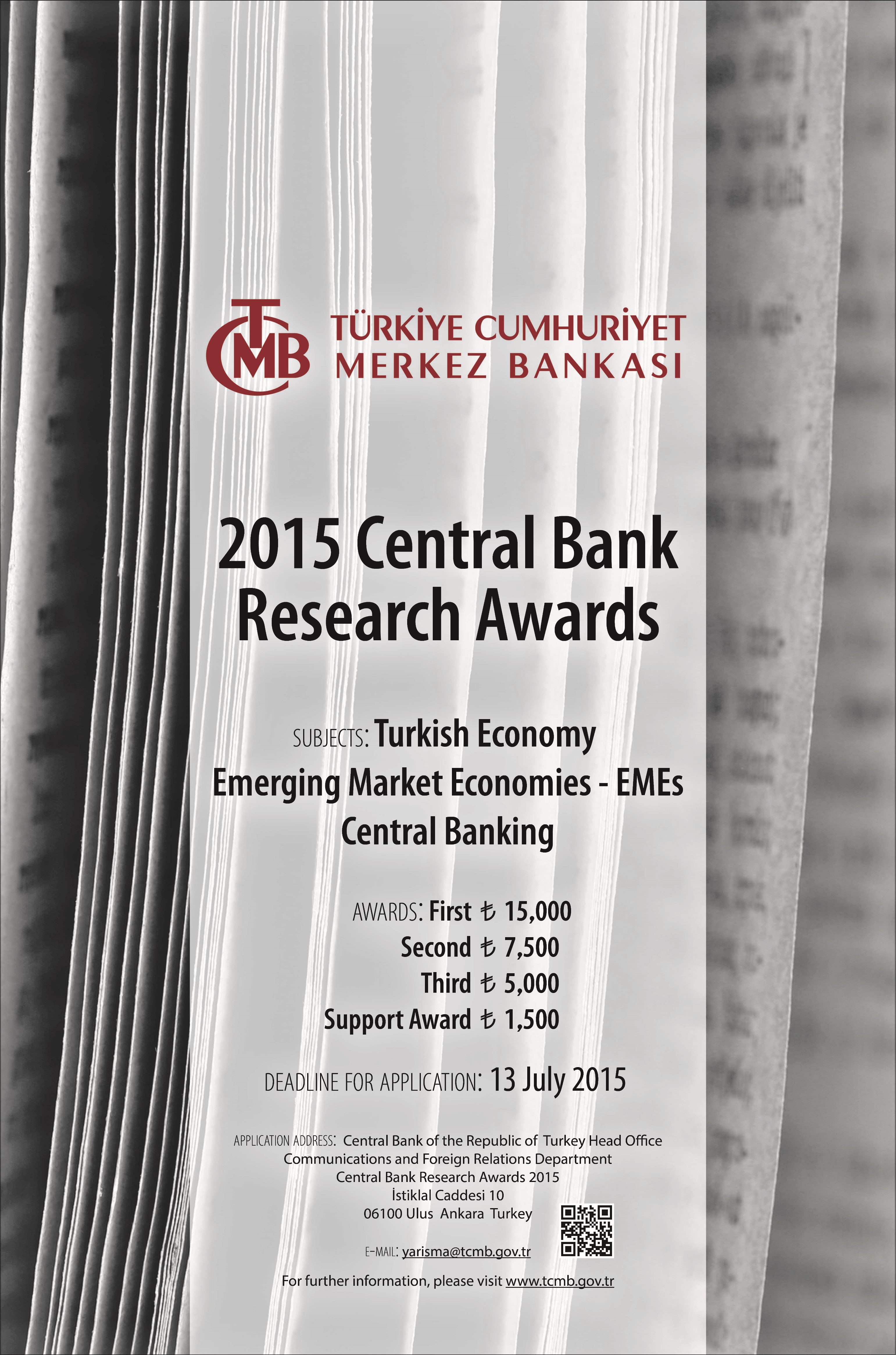 The Central Bank of the Republic of Turkey announces a call for the “2015 Research Awards” submissions. With the 2015 Research Awards, the Bank intends to support academic studies in the field of Turkish economy, emerging market economies and/or central banking, and make these studies accessible to a larger audience. The deadline for applications is 13 July 2015, close of business. Application form and further information about the awards can be accessed from the link below.